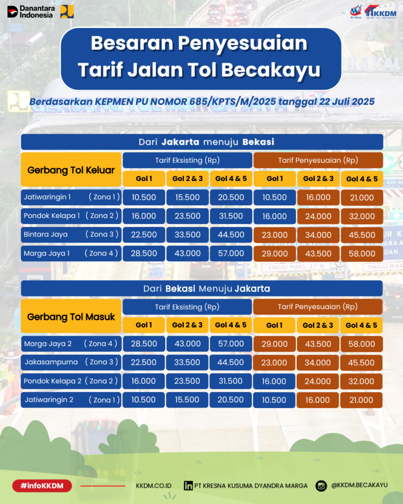 Jakarta, SenayanTalks – PT Kresna Kusuma Dyandra Marga (KKDM) selaku pengelola Jalan Tol Bekasi–Cawang–Kampung Melayu (Becakayu) akan memberlakukan penyesuaian tarif mulai Sabtu, 9 Agustus 2025 pukul 06.00 WIB. Kenaikan ini berdasarkan Keputusan Menteri Pekerjaan Umum Nomor 685/KPTS/M/2025 tentang Penetapan Golongan Kendaraan dan Penyesuaian Tarif Tol. Tarif baru berlaku berbeda pada setiap zona dan golongan kendaraan. […]