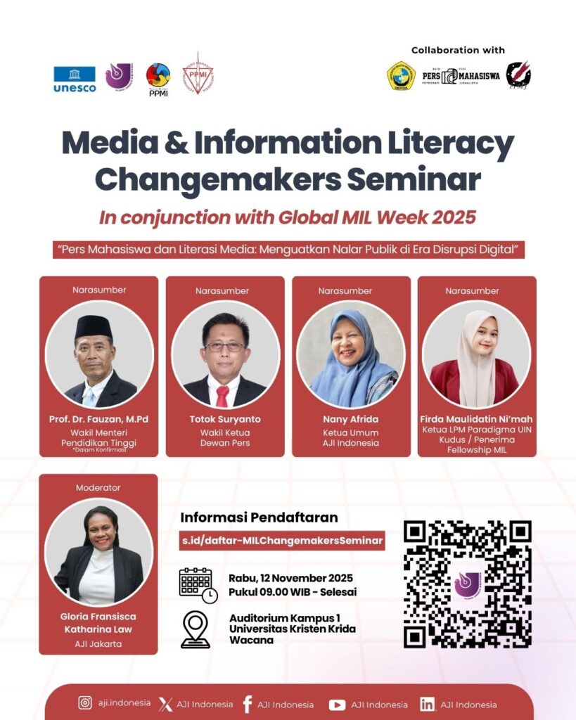 Jakarta, SenayanTalks — Aliansi Jurnalis Independen (AJI) bersama Forum Alumni Aktivis Perhimpunan Pers Mahasiswa Indonesia (FAA PPMI) dan PPMI, dengan dukungan UNESCO, menggelar Media & Information Literacy (MIL) Changemakers Seminar di Universitas Kristen Krida Wacana (UKRIDA), Jakarta Barat, Rabu (12/11). Acara ini menjadi bagian dari rangkaian MIL Training bertema “Pers Mahasiswa dan Literasi Media: Menguatkan […]