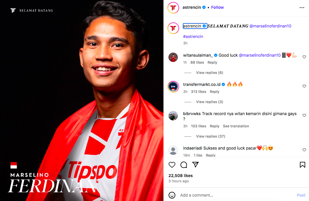 Dalam unggahan di akun instagramnya, @astrencin mengucapkan “Selamat Datang Marselino Ferdinan” sambil memberi tautan ke akun miliki Marselino @marselinoferdinan10.