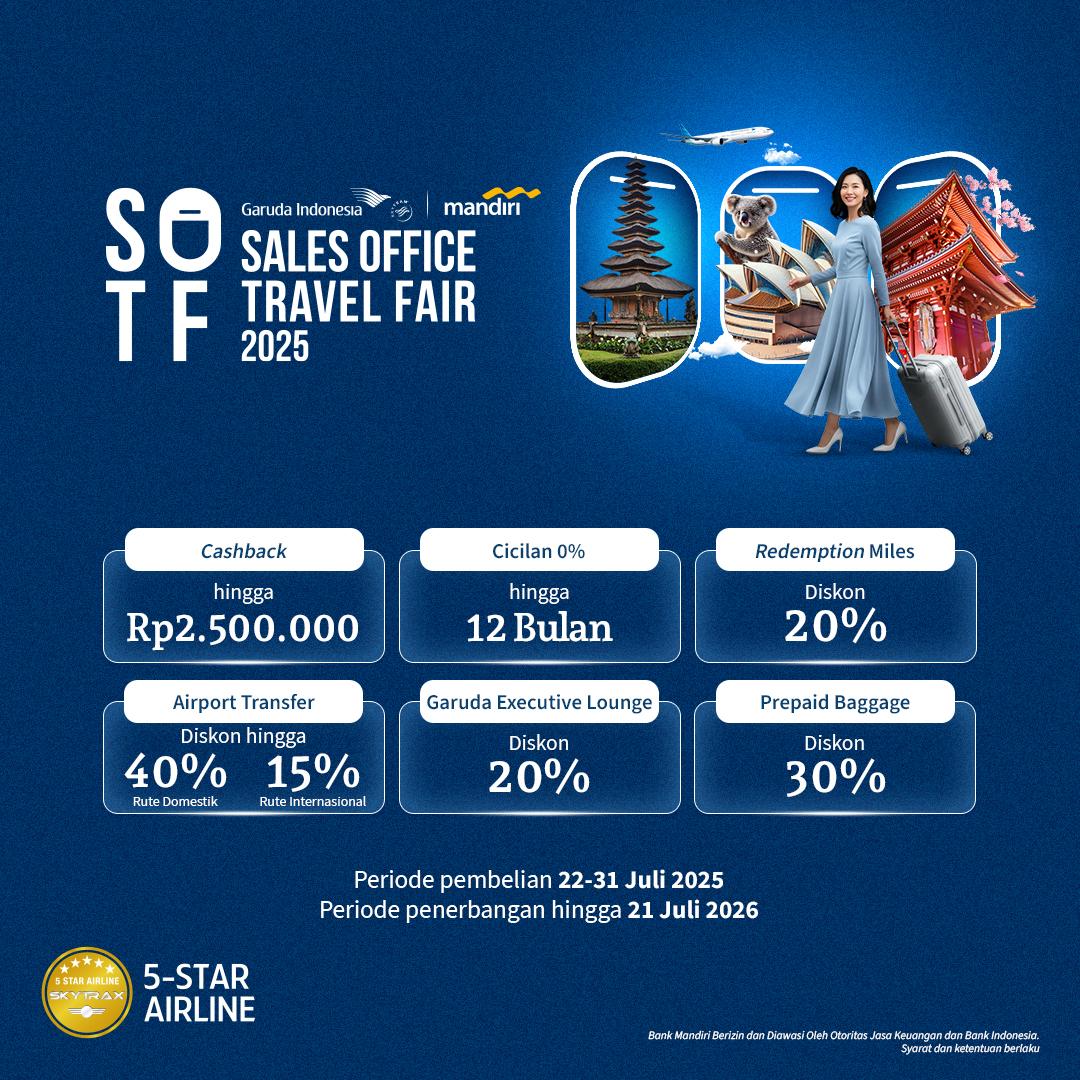 SOTF 2025 menyediakan lebih dari 600 ribu kursi penerbangan dengan tarif khusus, yang dapat diakses melalui seluruh kantor penjualan Garuda Indonesia, baik di dalam maupun luar negeri.
