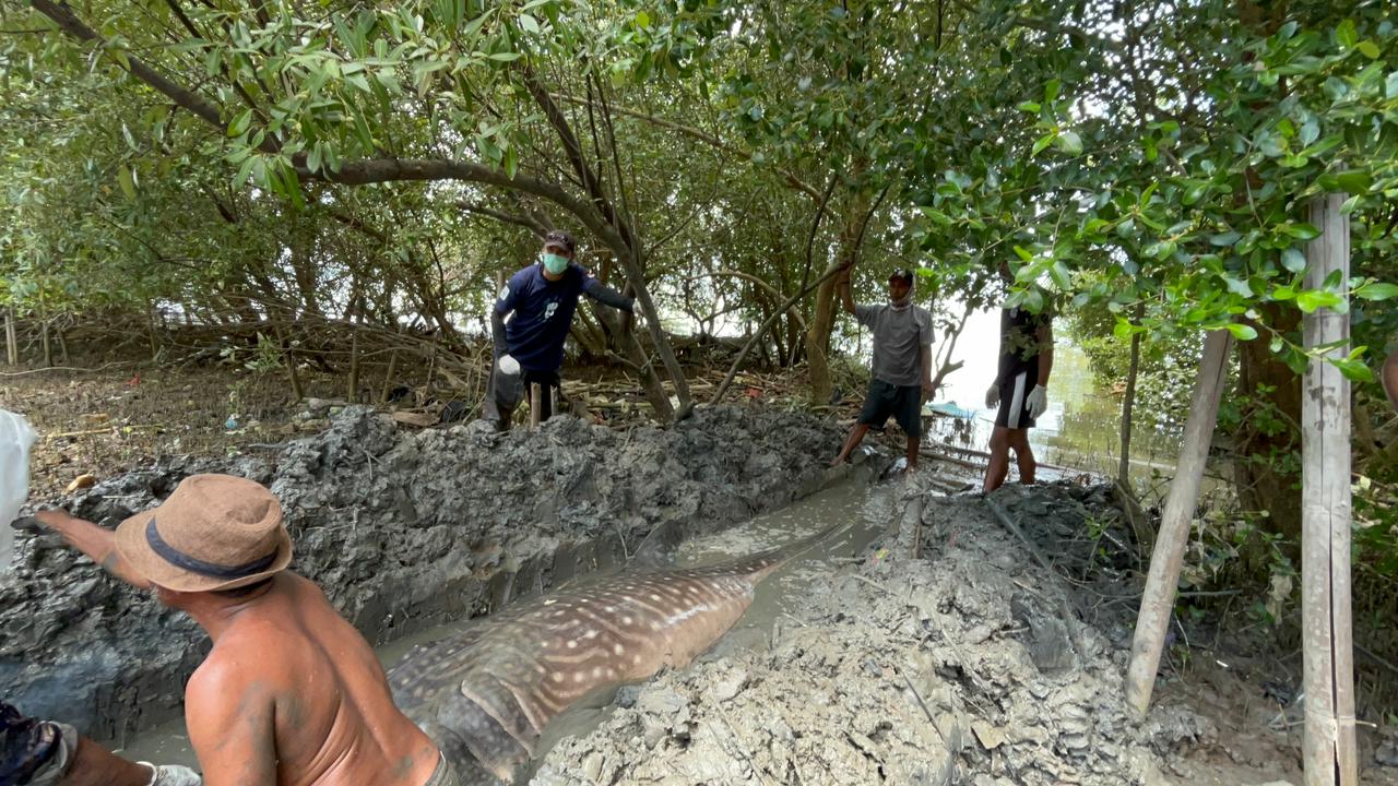 Setelah proses identifikasi selesai, bangkai hiu paus dikuburkan di area mangrove sedalam sekitar satu meter dengan panjang lubang enam meter.