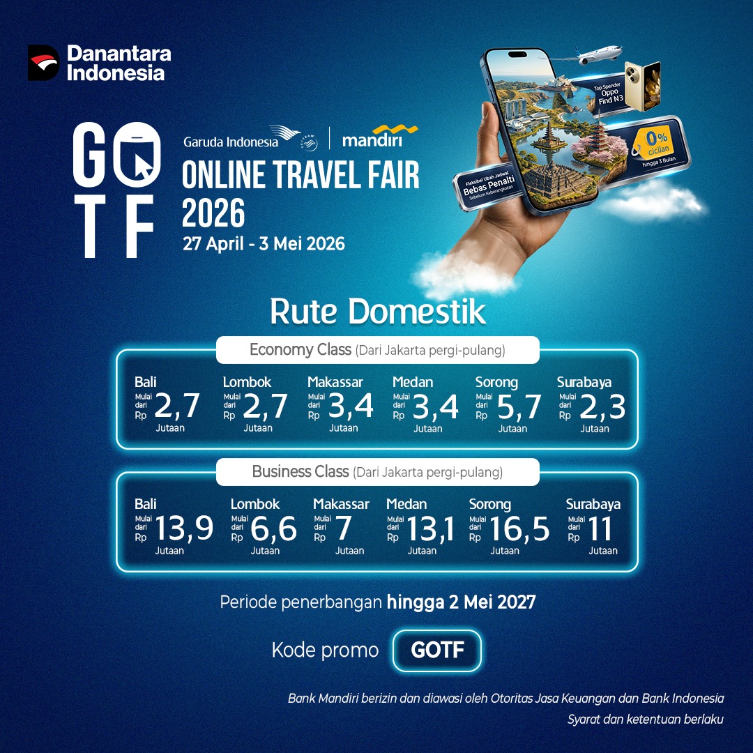 Jakarta, SenayanTalks – Maskapai penerbangan nasional Garuda Indonesia kembali menggelar Garuda Indonesia Online Travel Fair (GOTF) 2026 yang menjadi gelaran kedua pada tahun ini. Dalam gelaran kali ini, Garuda Indonesia kembali berkolaborasi bersama Bank Mandiri sebagai bank partner untuk menghadirkan sedikitnya 200 ribu kursi penerbangan domestik dan internasional dengan penawaran menarik.