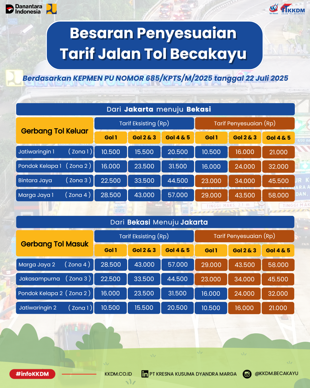 Direktur Utama PT KKDM, Aris Mujiono, menjelaskan bahwa penyesuaian tarif dilakukan guna menjaga keberlangsungan pelayanan jalan tol secara optimal dan berkelanjutan.