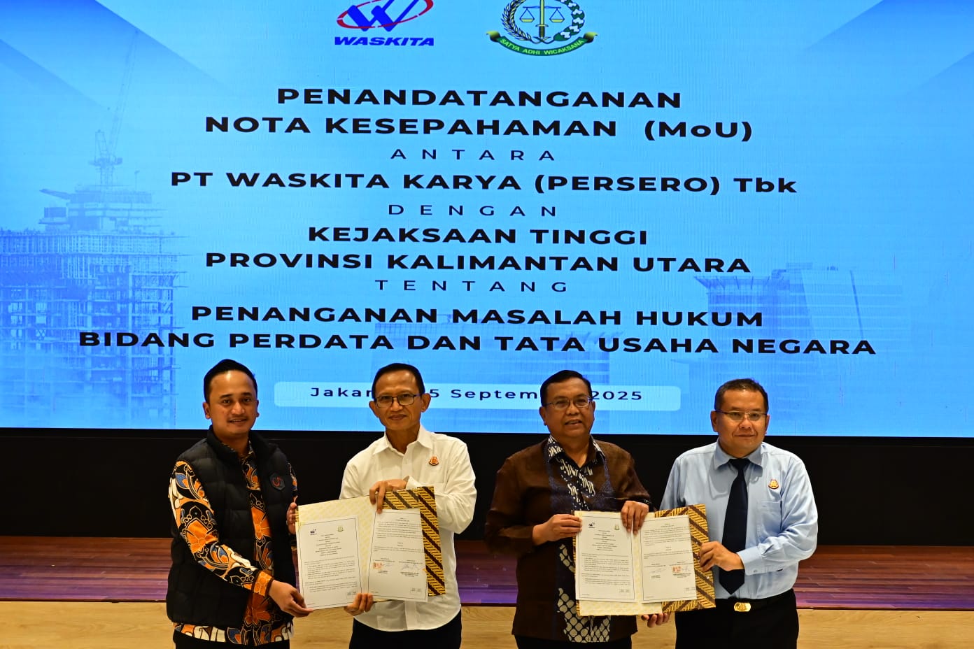 Perjanjian tersebut ditandatangani oleh Direktur Operasi I Waskita Karya Ari Asmoko dan Plt Kepala Kejati Kaltara I Made Sudarmawan di Jakarta. Lewat kerja sama ini, Waskita akan memperoleh bantuan hukum, pertimbangan, serta pendampingan dari Kejati Kaltara dalam pelaksanaan proyek, termasuk dalam hal peningkatan kapasitas sumber daya manusia.